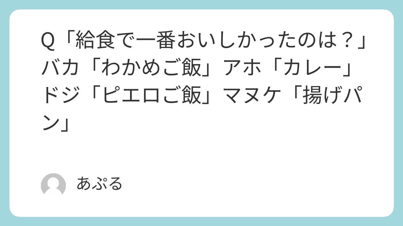 Q「給食で一番おいしかったのは?」バカ「わかめご飯」アホ「カレー」ドジ「ピエロご飯」マヌケ「揚げパン」