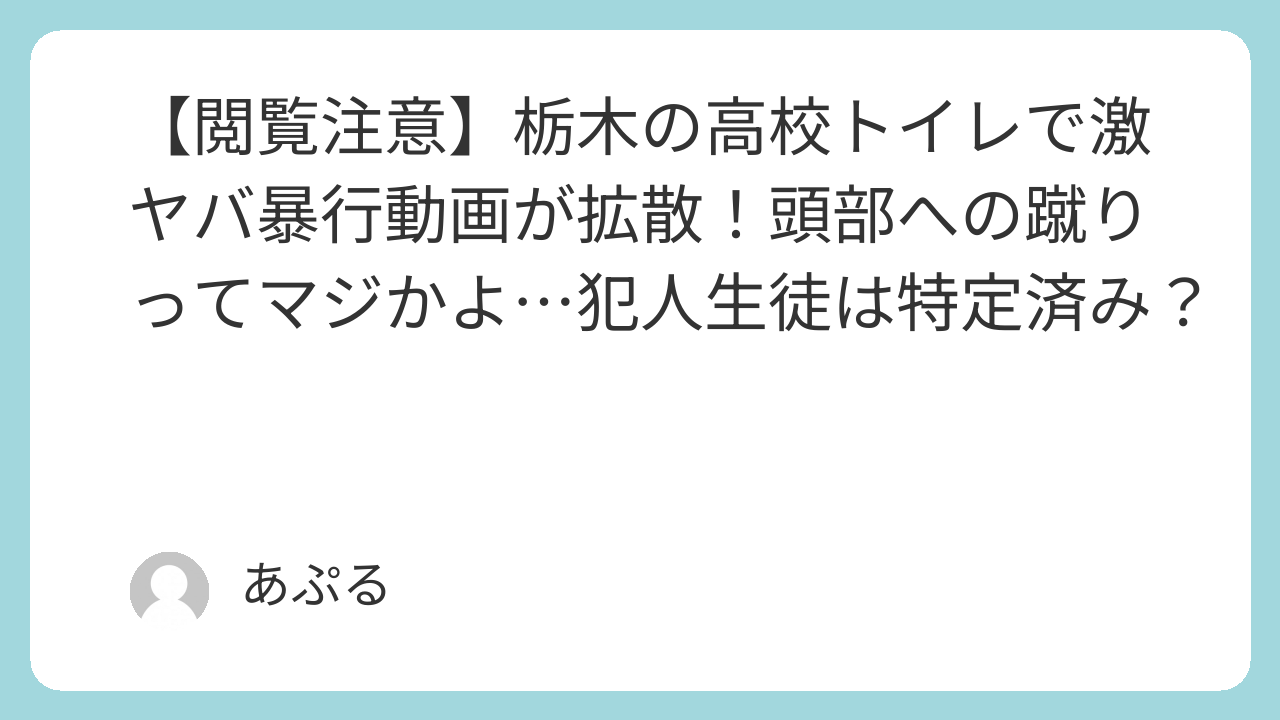 栃木県内の県立高校とみられるトイレで、男子生徒が別の生徒へ激しい暴行を加える動画がSNSで拡散し、炎上している。頭部への蹴りなども映っており、動画内の生徒の個人情報も特定され、ネットで大きな波紋を呼んでいる。栃木県教育委員会は動画の真偽は不明としつつも、すでに警察が捜査に着手し、関係者への聞き取りを進めていることを明らかにした。