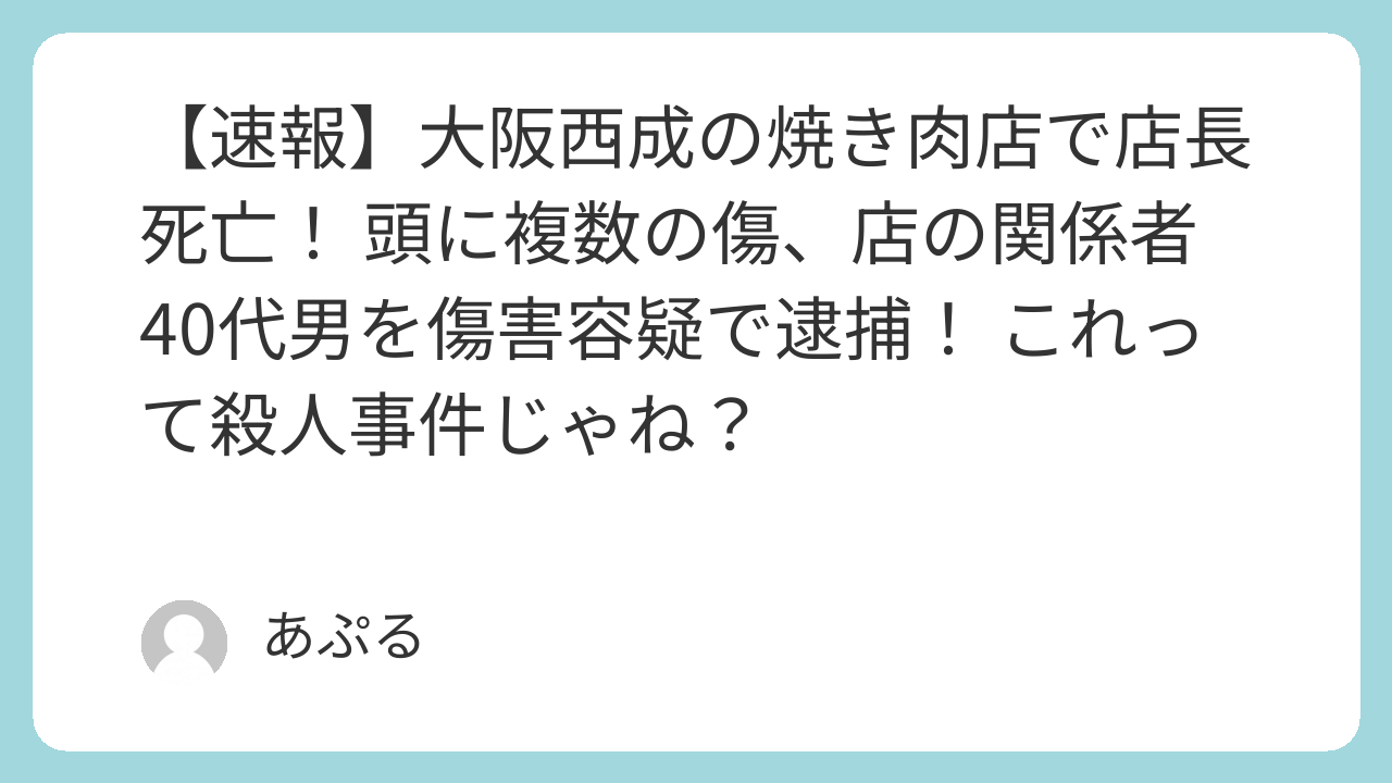 大阪市西成区の焼き肉店で店長が死亡し、店の関係者が傷害容疑で逮捕されるという衝撃的な事件が発生しました。頭部に複数の傷があることから、単なる傷害では済まされない可能性も指摘されており、今後の捜査で死亡との関連や動機が明らかになることが待たれます。事件の全容解明が急がれます。