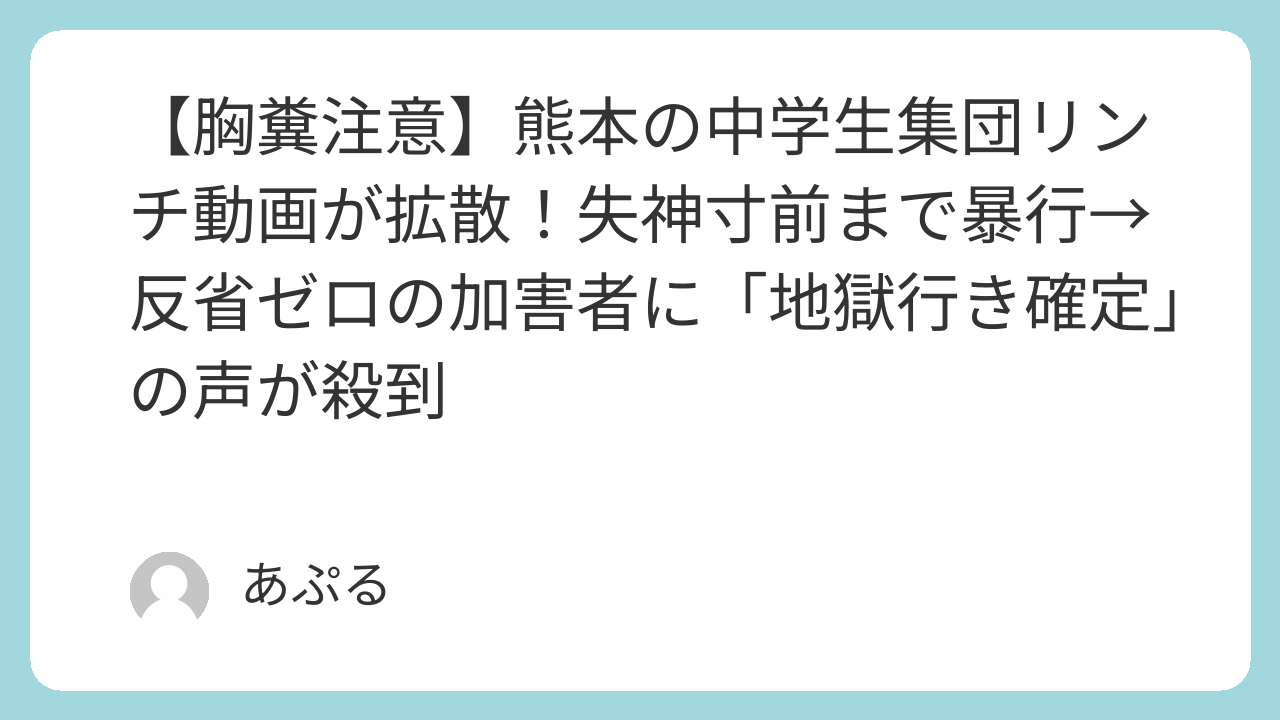 熊本県内で中学生とみられる少年グループによる集団暴行動画がSNSで拡散し、激しい怒りの声が相次いでいる。動画では、少年が別の少年を首絞め、失神寸前まで殴打や顔面をサッカーボールのように蹴るなどの残虐行為を行い、周囲は「死ね」「落ちるまで」と囃し立てている。加害者とされるアカウントでは反省が見られず、「少年法は適用されない」「殺人未遂で逮捕しろ」「地獄が待っている」といった批判が殺到している。