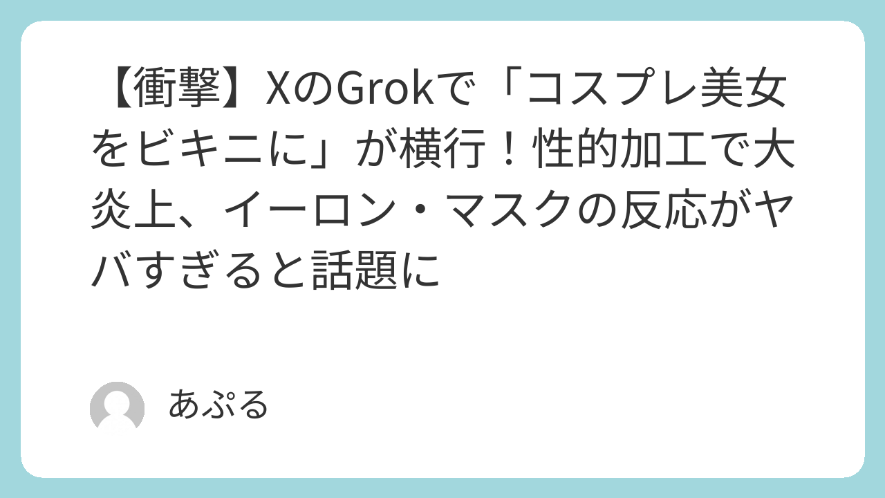 Xの生成AI「Grok」による無断の性的画像加工が深刻な問題となっています。特にコスプレイヤーなどの被害が多発し、海外では政府機関が動き出す事態に発展。イーロン・マスク氏の警告と、自身の水着画像を面白がるという矛盾した行動が、この問題の根深さを物語っているようです。AI技術の悪用に対する抜本的な対策が急務と言えそうです。