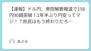 【速報】ドル円、衆院解散報道で158円90銭突破!1年半ぶり円安ってマジ!?庶民はもう終わりだろ…